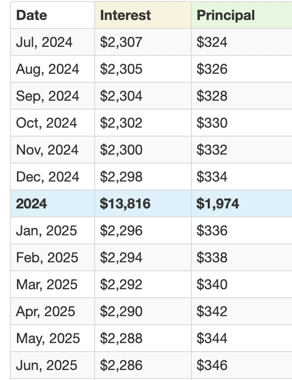 In this scenario, below are your monthly payments in the first year of your loan. Yes, you’re reading that correct. You are paying almost EIGHT TIMES as much in interest as you are toward the principle (ie “equity”). Oh, and I didn’t even include closing costs here, which are significant. On your first payment, you paid the bank $2,307. You paid yourself (your equity) $324.